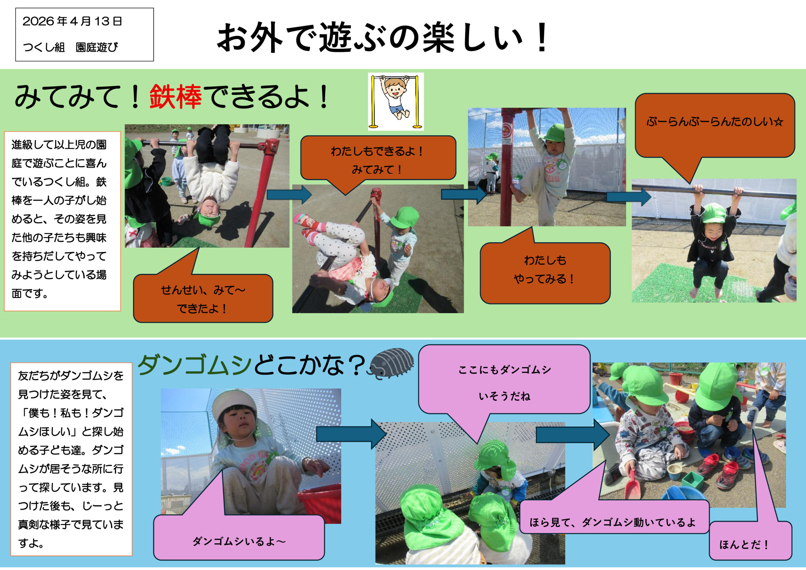 TOP > 愛育園ブログ > お外で遊ぶの楽しい! つくし組