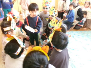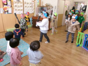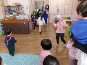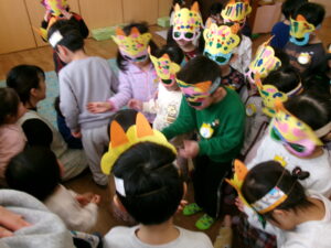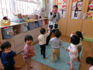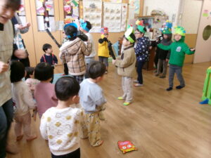 節分楽しみました。 お部屋で「おにはそと、福はうち」と豆に見立てた段ボールを投げて遊んでいた子ども達。
