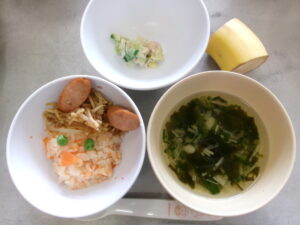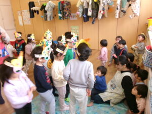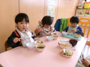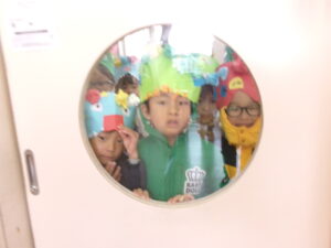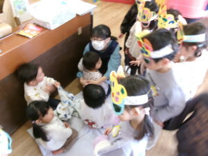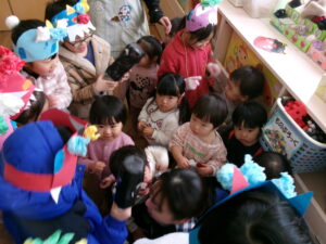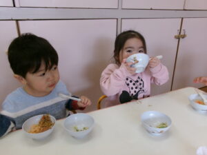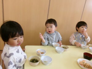 すると…なんだか廊下から音が‼なんだなんだ~と見に行くと鬼がい~っぱい! 鬼にドキドキしながらも、勇気を出して豆を投げたり、先生の影に隠れたりする子もいました。 季節の行事、楽しく経験出来ました。給食は、お給食さんが頑張って作ってくれた節分メニュー♡ とってかわいいオニさんのご飯を喜んで食べています! |