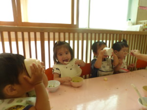 お給食もコップや器を持って自分で! 上手になったね。 |