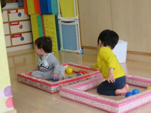 赤・黄色・青のボールがいっぱい♪ 子ども達は興味津々で集まってきたよ♪ |