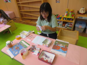 今日の子育て講習会は 「牛乳パックのリュック作り」