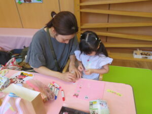 子ども達が喜ぶリュックを作ろうと お家からもイラストや写真、テープを 持参していただきました(*^^*) どんなリュックが完成するでしょうか♪?