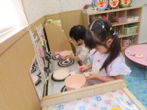 ママ達が仕上げ作業の間 仲良くおままごとをしていたよ(*^^)v |